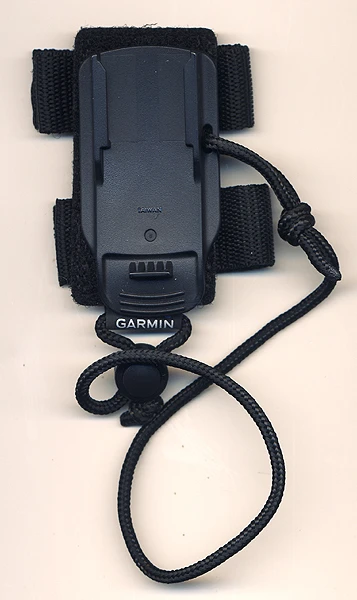 - das GPS-Gerät wird zusätzlich mit verstellbarer Fangschnur gesichert, die die Rückenplatte mit der Trägerbefestigung verbindet