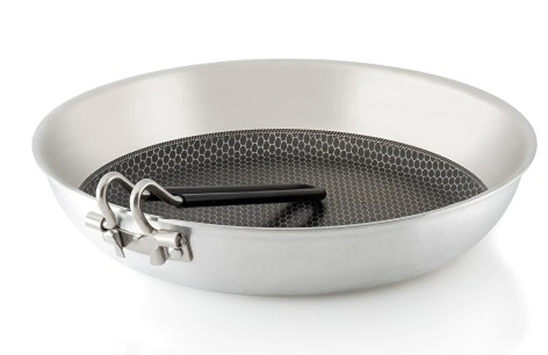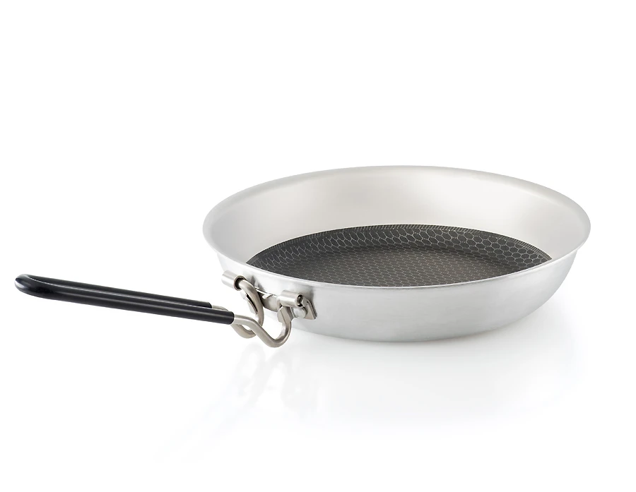Diese Pfanne vereint die Vorteile mehrerer Materialien: der Korpus ist aus Alu, das leitet und verteilt die Hitze des Kochers sehr gut. Innen ist die Pfanne aus Edelstahl, mit vertieft und damit geschützt angebrachter Nonstick-Beschichtung. Damit backt nichts so leicht an, und das Bratgut kann problemlos und ohne Gefahr für die Beschichtung verrührt werden. Für alles zum Braten ideal – wenn Rührei oder Pancakes bereitet werden sollte ein leichter Fett-/Öl-Film den Boden bedecken um Anbacken an den Edelstahlwaben zu verringern.
