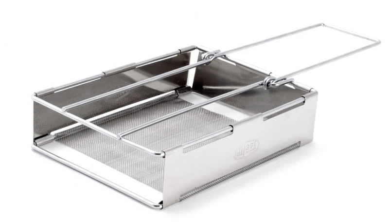 Ein in sich zusammen klappbarer Toast-Aufsatz in ansprechender Optik für optionale Gaskocher oder offene Feuer.