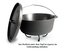 und bringt ein Dreibein für den Einsatz in der Kochfeuerglut mit