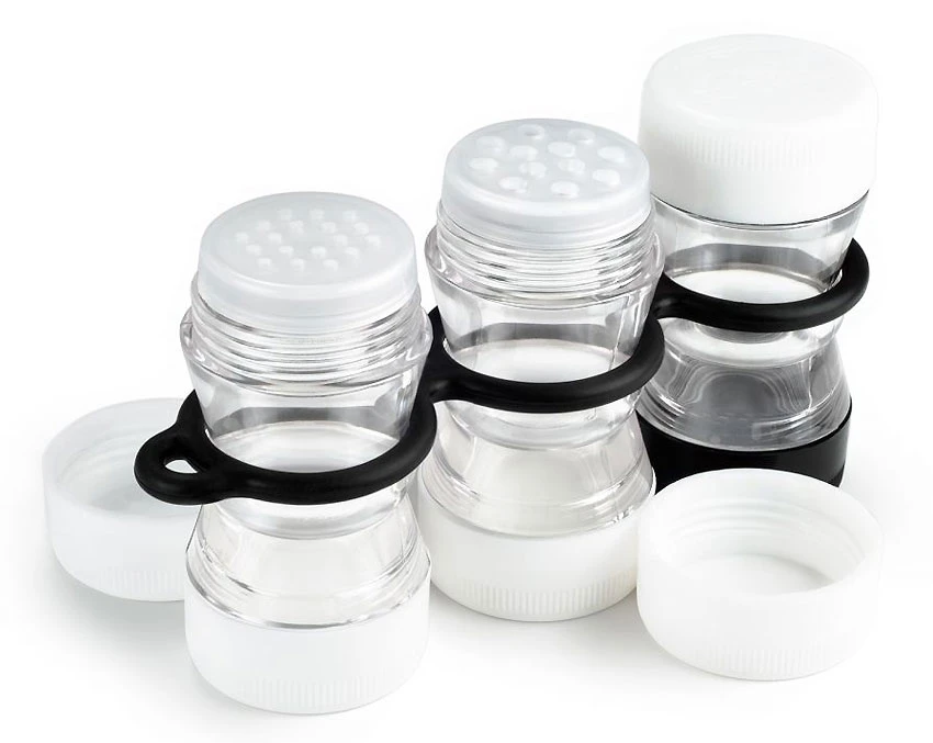 Ein Set aus drei Gewürzbehältern, die jeweils zweiteilig sind. Es können mit diesem Set also 6 Gewürze wassergeschützt und gut dosierbar auf Tour mitgenommen werden. Selbstverständlich auch, bei weniger Bedarf, einzelne Streuer.