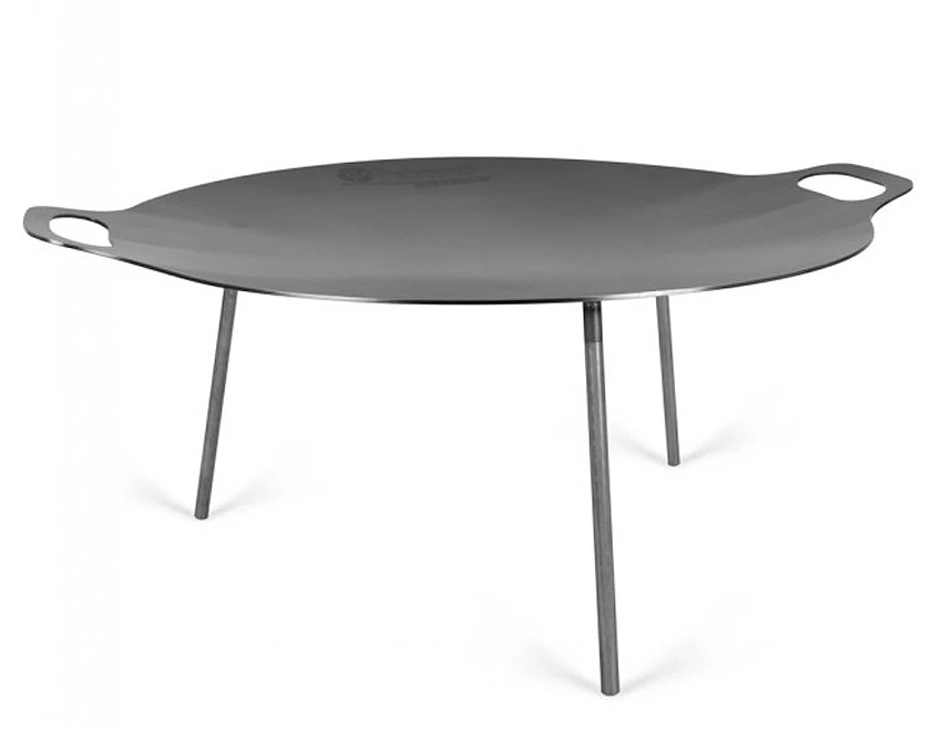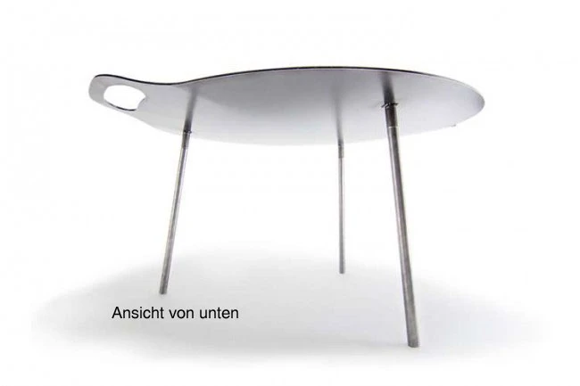 Eine Grill- und Feuerschale für eben ein Boden-verschonendes (Lager-)Feuer, oder eigentlich eine Grillpfanne für Grill- und Bratgerichte für bis zu 6/8 Personen. Aus Stahl, mit abnehmbaren Beinen über Grill, Lagerfeuer oder dem Atago nutzbar.