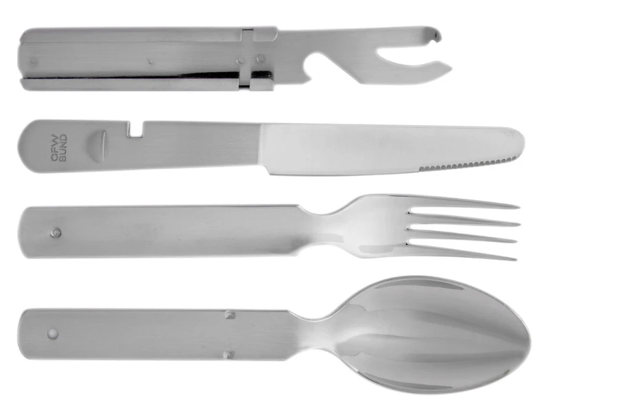 Die Halterung für das Besteck ist gleichzeitig auch Dosen- und Flaschenöffner. Lieferung im Kunststoffetui.
