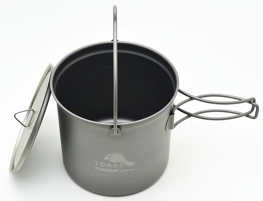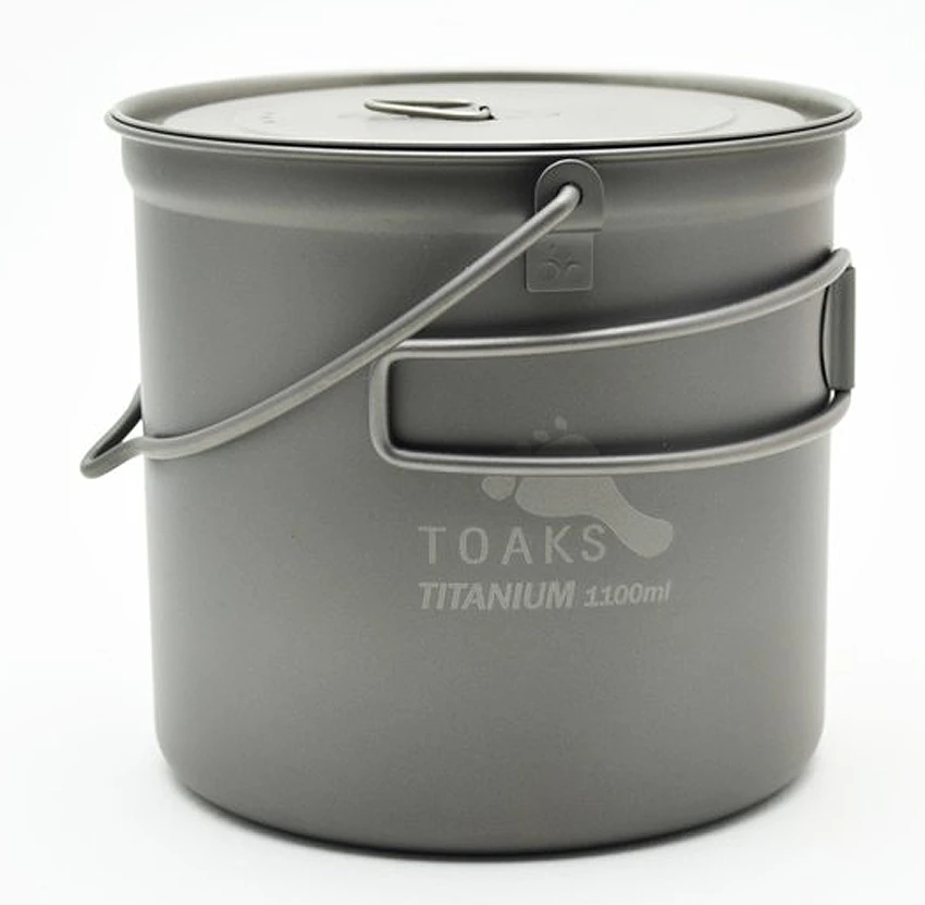 Ein relativ großer Topf aus Titanium, ausreichend im Volumen für 1 luxuriösen UL-Trekker oder 2 genügsamere UL-Trekker. Volumen 1100 ml. Mit Deckel. Faltgriffen und Henkel – kann auch über Feuer genutzt werden.