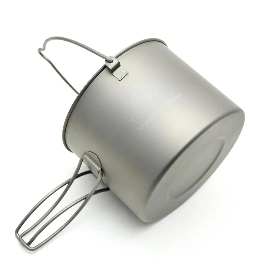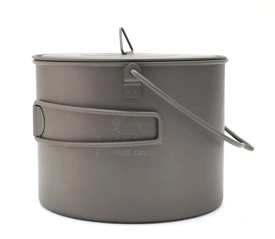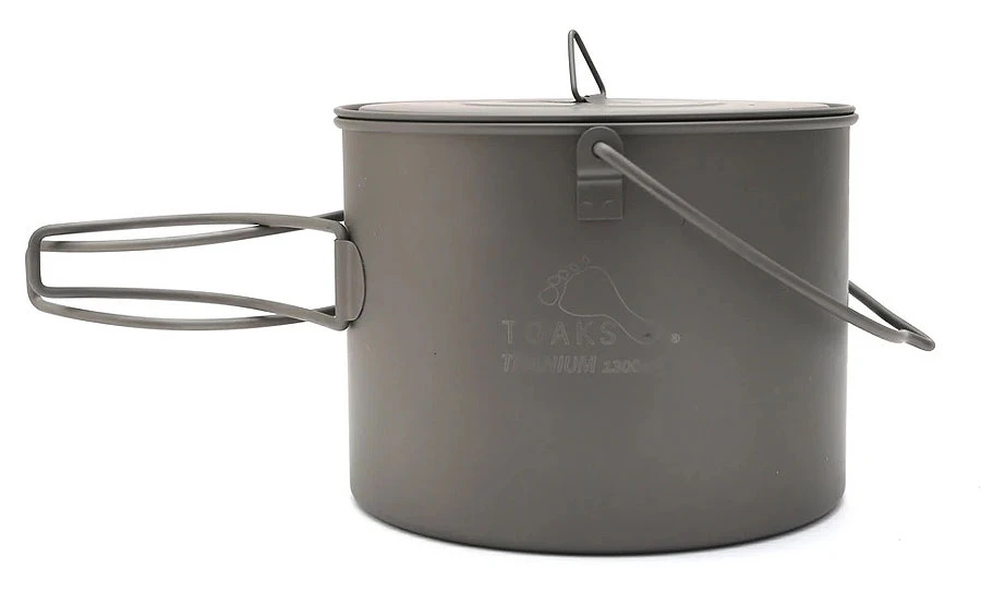 Ein relativ großer Topf aus Titanium, ausreichend im Volumen für 1 luxuriösen UL-Trekker oder 2 genügsamere. Volumen max 1350 ml. Mit Deckel. Faltgriffen und Henkel – kann auch über Feuer genutzt werden.