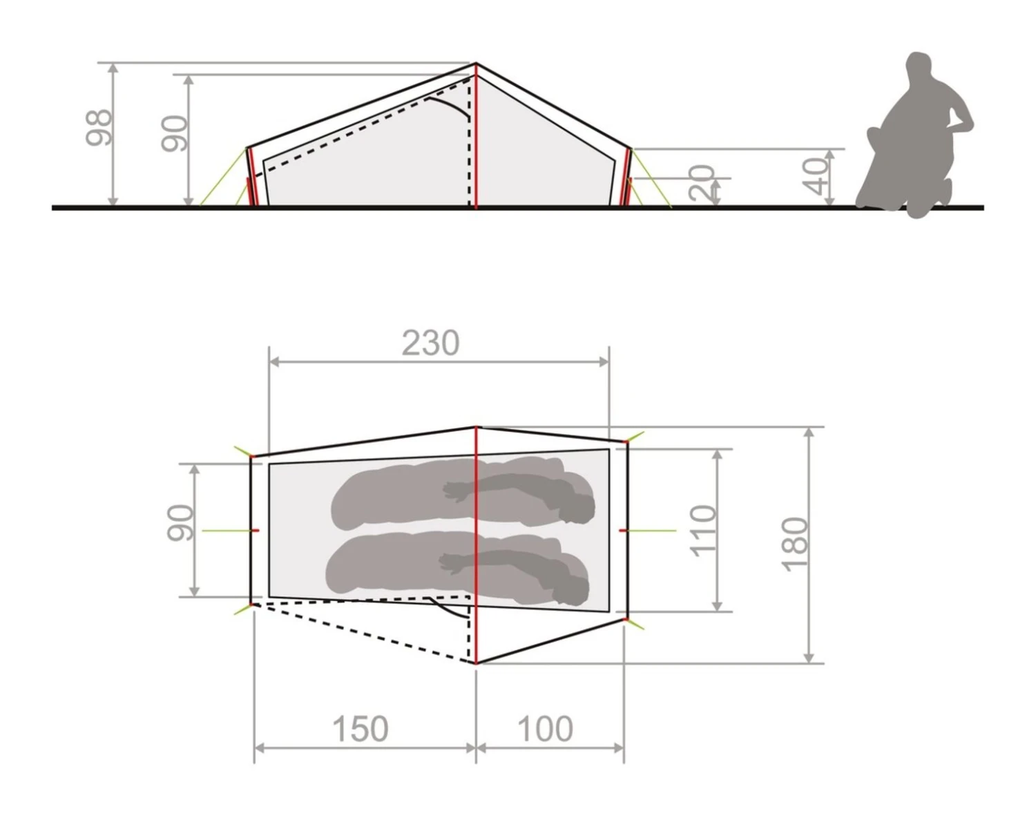 Rel leichtes Wanderzelt für Einsatz unter gemäßigten Bedingungen (was Wind betrifft) für nicht zu große Leute (Sitzhöhe).